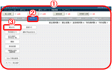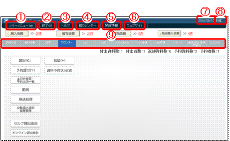 画面を開くまでの流れです。例えば貸出の場合、「@メインメニュー → Aカウンター → B貸出」の順番で画面を開きます〈画面5〉。