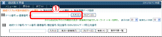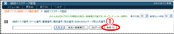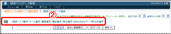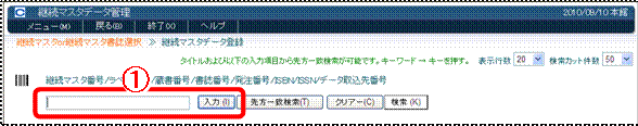 継続資料(継続マスタ)は、いずれかのIDを入力する(バーコードリーダーで読み取る)か、データーベースを検索して選択します。タイトルから短縮キーを入力して選択することも可能です。