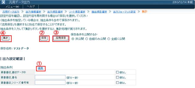 出力項目、ソート、抽出項目、出力フォーマットの確認を行い、変更する場合は編集〈画面8−@〉を