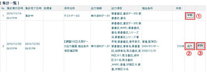 集計中の出力情報を中止したい場合は、中止したい項目の中断〈画面9−@〉をクリックして、集計を